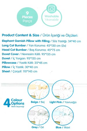 MNZ-Little Dream 9 Piece Sleeping Set محتويات المنتج: 1-وسادة زينة الفيل 34*40 سم 2-حماية الجانب 45*130 سم (2 قطعة)