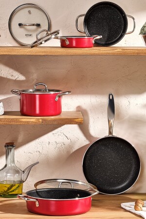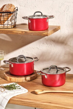 MNZ-Emsan Master Class 6 Piece Midi Cookware Set Set Set أحمر مجموعة محتويات 14 سم صلصة 1.2 لتر 16 سم صلصة 1.7 لتر 18 سم صلصة 2.2 لتر مواد