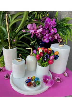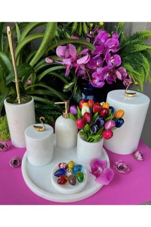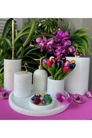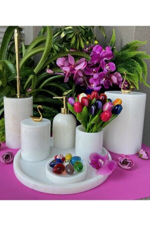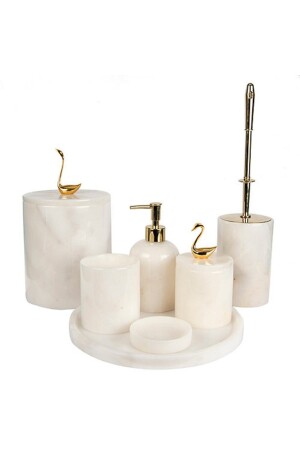 5 Parça Mermer Desen Mat Banyo Seti - Wc Fırçalık- Sıvı - Katı Sabunluk- Çöp Kovası- Diş Fırçalık
