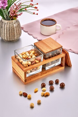 منز-إليفا الموقف الخشبي، حاوية تخزين 2 أقسام مع غطاء، كأس الإفطار المربع، كأس العشاء، مجموعة عرض الإفطار يتم إن
