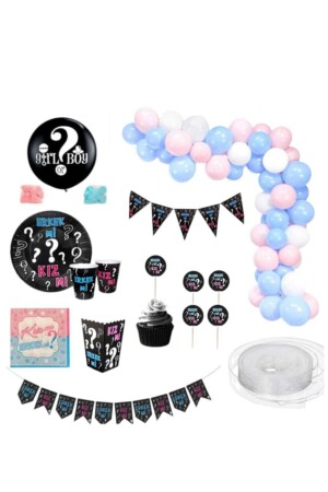 مجموعة تحديد الجنس من قبل المملكة: 30 بالون، جهاز سلسلة بالون 5 متر، مدفع 2 متر، 8 لوحات، 8 كوبات، بالون جنس 1 50 سم، 2 طواب