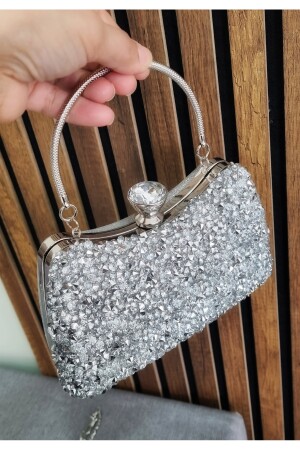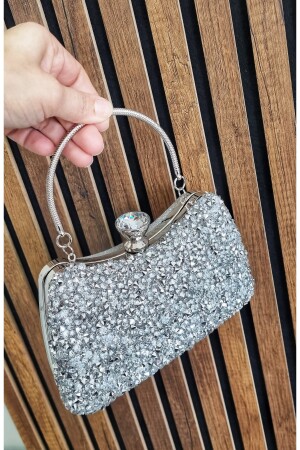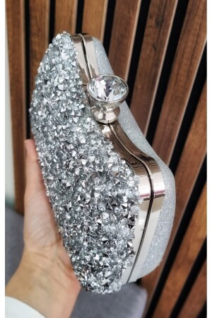Kadın Yuvarlak Gümüş Taşlı Bilezik Aksesuarlı Abiye Clutch Portföy Çantası