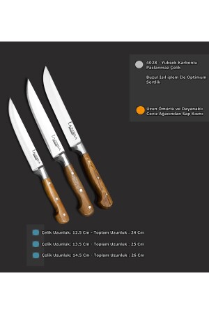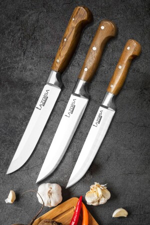 مكونات المنتج ومقاييس المنتج: 1 سكين مطبخ لازبيسا 26 سم 1 سكين مطبخ لازبيسا 25 سم 1 سكين مطبخ لازبيسا 24 سم ميز