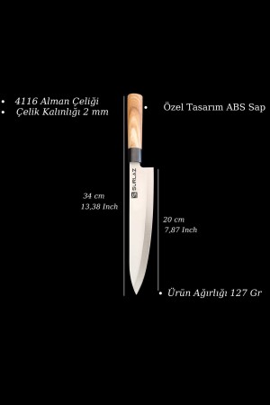 MNZ-الطول الإجمالي لسكين الطاهي لدينا هو 34 سم. طول المقبض هو 14 سم وطول السكين هو 20 سم، وفقا لمعايير القبول العامة. فول