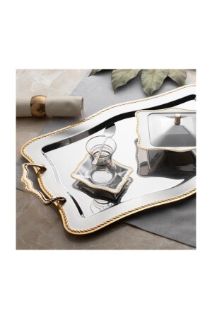 Lüx Kare Kelebek Aksesuarlı Paslanmaz Çelik 6’lı Gümüş Kahve, Çay, Dekoratif Sunum Servis Tepsisi MZKBK667