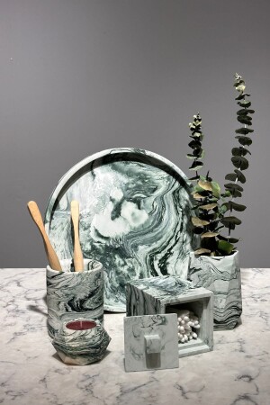 مجموعة الحمام الخضراء من المسلسل من السلسلة من المرمار من نوع MNZ-Marble Look Concrete Green Bathroom Set تأتي في 5 قطع: صالونة، 2 حاملات