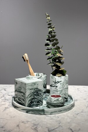 5 Parça Mermer Desen Mat Banyo Seti - Wc Fırçalık- Sıvı - Katı Sabunluk- Çöp Kovası- Diş Fırçalık