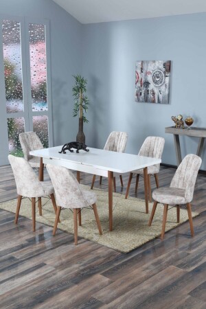 سلسلة MNZ-Snow بيضاء يمكن تمديدها طاولة الطعام والمطبخ مع 6 مقاعد - كريم
