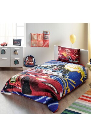 Rally Yarış Arabalı Desenli Mavi Çarşaflı 2 Yastık Kılıflı -Ranforce Tek Kişilik Nevresim Takımı