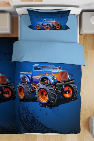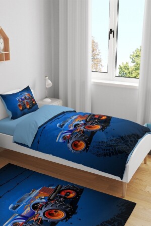 Rally Yarış Arabalı Desenli Mavi Çarşaflı 2 Yastık Kılıflı -Ranforce Tek Kişilik Nevresim Takımı