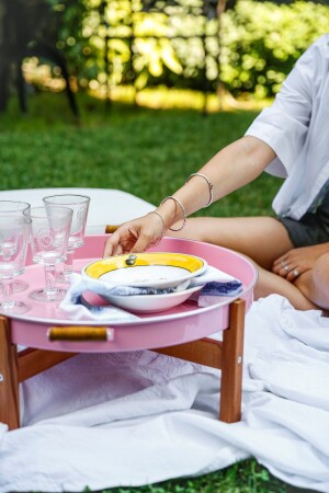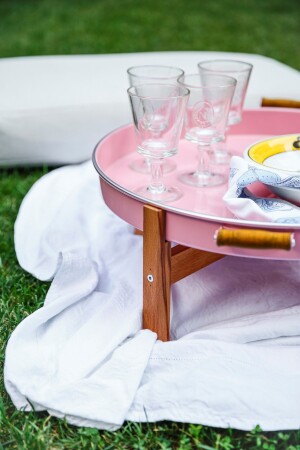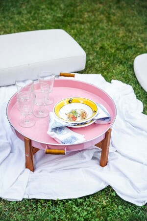 طاولة الزهور الوردية ومطابقة ذات الساقين الخشبية. محمولة ومثبتة. يمكن بسهولة نقل ووضع طاولة القهوة ومطابقة الطاولة أينما