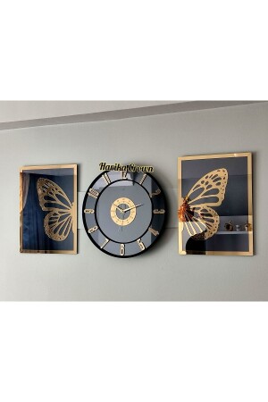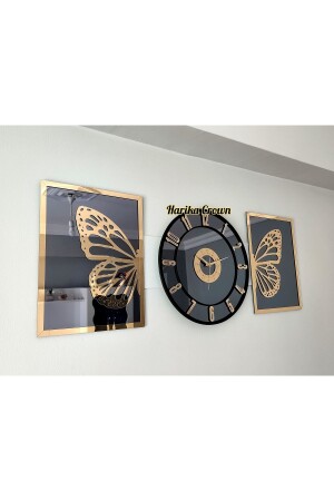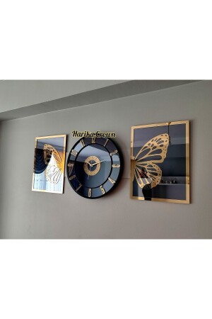 Altın Renk Plexiglass Aynalı 3d Kabartmalı El Boyaması Piyano Model Duvar Saati- Tablo 3 Parça