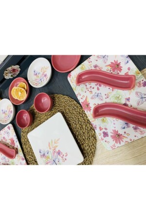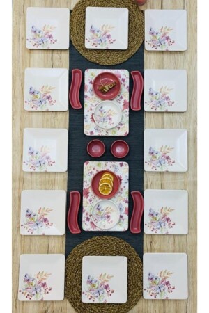 مكونات المجموعة من 12 لوحة كعك 21 سم •4 أطباق زيتونية •2 أجهزة لوحة القارب 31-21 سم •4 أجهزة 13 سم لوحة الافطار •