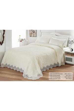 Krem Çift Kişilik Fransız Güpürlü Çeyizlik Battaniye Takımı