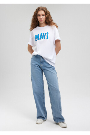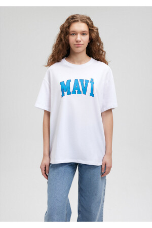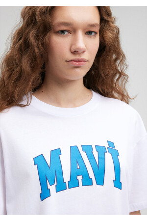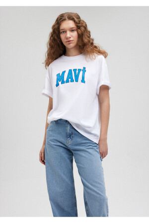قمصان MNZ-بيضاء مع طباعة الشعار الأزرق من مجموعة شعار Mavi حجمها العريض / قصير القصير القصير القميص نموذج القياس: ارتفاع: