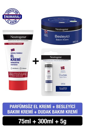 كريم غذائي من الصيغة النرويجية 300 مل + كريم يد خالي من العطور 75 مل + لحم الشفاه PKTPRFSZKRMDKKRM