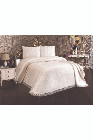 مجموعة غطاء السرير لدينا تتكون من 3 قطع: 1 غطاء (240 سم x 250 سم) و 2 وسادة رمي (50 سم x 70 سم).