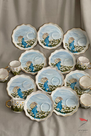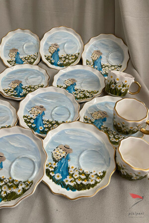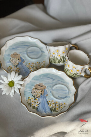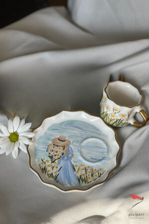 MNZ-pixiperi - 100% كوب قهوة تركية مصبوغة باليد وزهور ديزي ذات الخلفية الزرقاء مصورة بالخلفية التركية • استمتاع القهو
