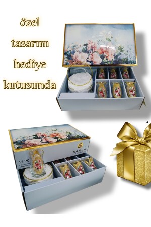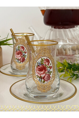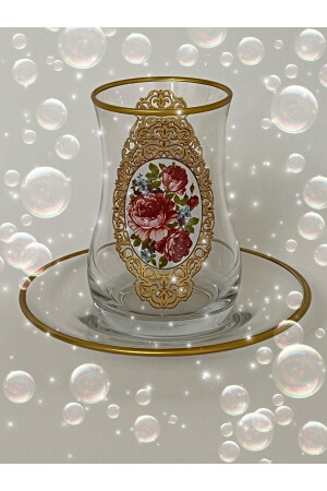 إنز- منتجنا يتضمن 6 كوبات شاي زجاجية و 6 صوصات شاي. أصلية مع نمط الذهب والوردة. يتم إنتاجه في الفرن عالية الجودة