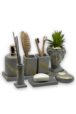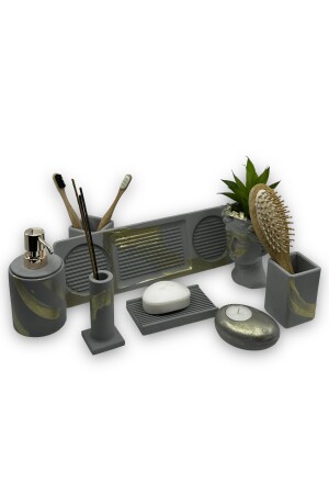 5 Parça Mermer Desen Mat Banyo Seti - Wc Fırçalık- Sıvı - Katı Sabunluk- Çöp Kovası- Diş Fırçalık