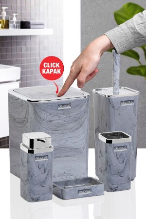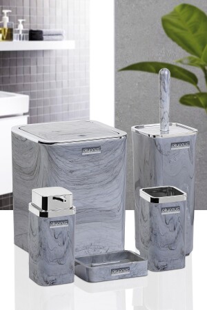 5 Parça Mermer Desen Mat Banyo Seti - Wc Fırçalık- Sıvı - Katı Sabunluk- Çöp Kovası- Diş Fırçalık
