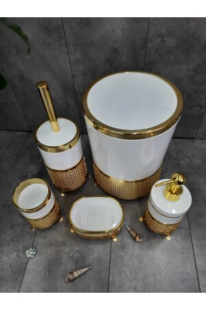 5 Parça Mermer Desen Mat Banyo Seti - Wc Fırçalık- Sıvı - Katı Sabunluk- Çöp Kovası- Diş Fırçalık