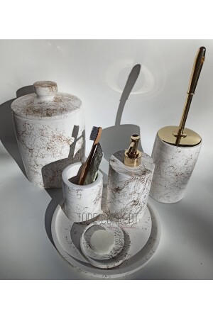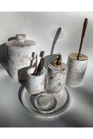 5 Parça Mermer Desen Mat Banyo Seti - Wc Fırçalık- Sıvı - Katı Sabunluk- Çöp Kovası- Diş Fırçalık