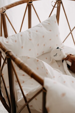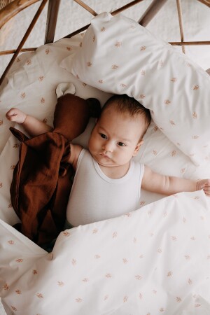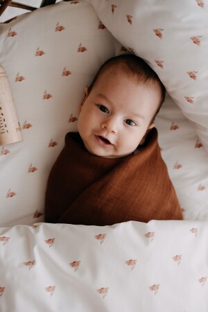 مصنوع من منتجنا من نسيج 100٪ من المسلين و 100٪ من القطن والتي طبعت بألوان مصدقة عضوية. يتضمن المجموعة غطاء من المسلين