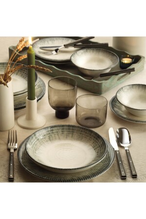 مجموعة العشاء من 24 قطعة من طقم MNZ تتكون من 6 أطباق خدمة، 6 أطباق عميقة، 6 أطباق كيك و 6 أكواب