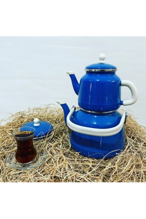 مجموعة من الـ MNZ-Enamel Vintage Blue Teapot Set مع غطاء مزدوج ALEVÇYD3