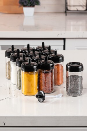 12'li Kapağı Kendinden Kaşıklı Ve Etiketli Baharatlık Seti 300 ml Gold Etiketli Cam Baharat Takımı