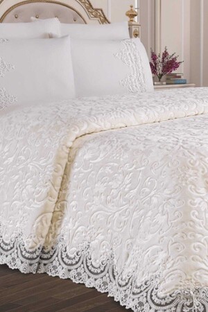 Krem Çift Kişilik Fransız Güpürlü Çeyizlik Battaniye Takımı