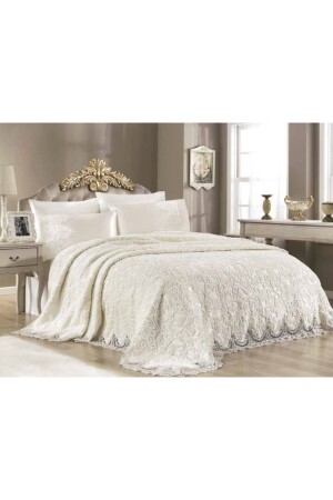 Krem Çift Kişilik Fransız Güpürlü Çeyizlik Battaniye Takımı