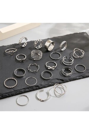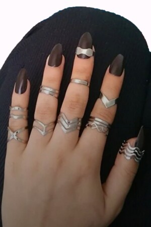 تمثل صور MNZ. سيتم إرسال مجموعة من 10 حلقات مفصلة مختلفة في اللون الفضي. حجم قابلة للتعديل - مناسبة لجميع الأصابع. تتكون من