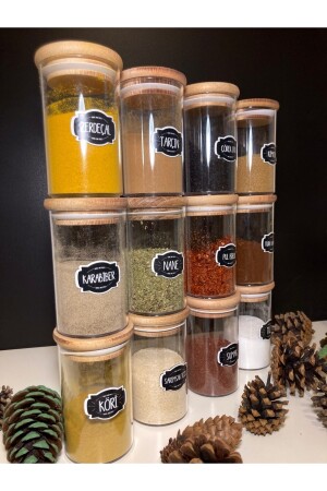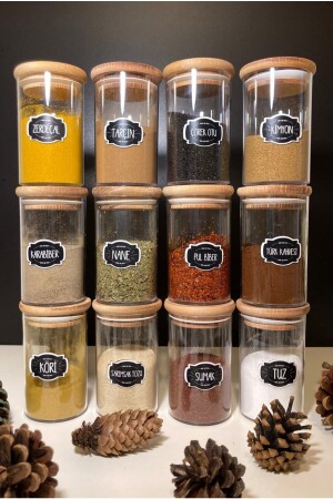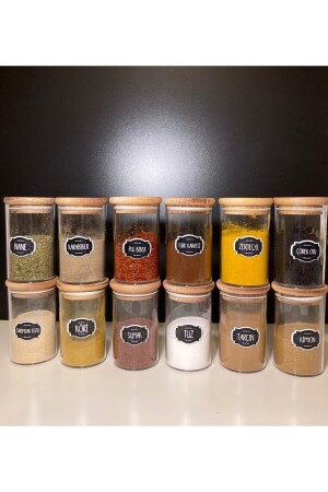 12'li Kapağı Kendinden Kaşıklı Ve Etiketli Baharatlık Seti 300 ml Gold Etiketli Cam Baharat Takımı