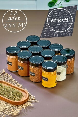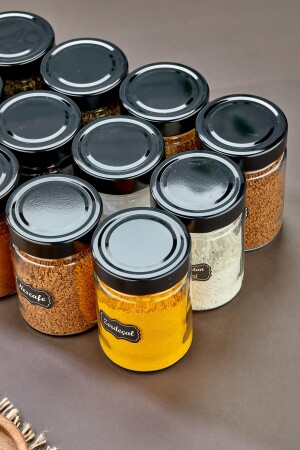 12'li Kapağı Kendinden Kaşıklı Ve Etiketli Baharatlık Seti 300 ml Gold Etiketli Cam Baharat Takımı