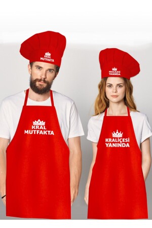 مجموعة من 2 فرشاة مطبخ حمراء و قبعة الطاهي - الملك في المطبخ - ملكته بجواره طباعت eckirmizikombintam