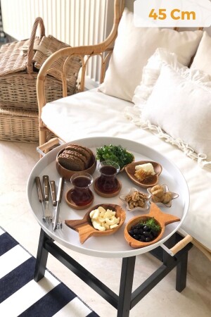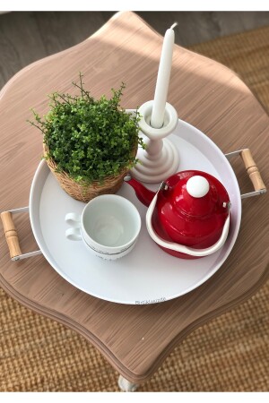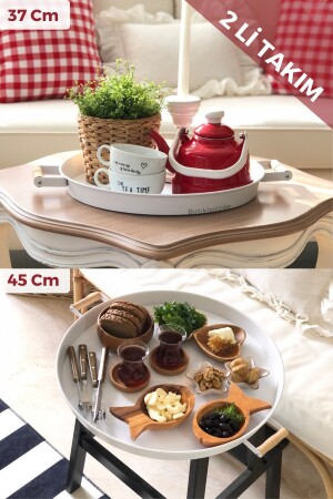 3 Lü (51- 37- 30 CM) Ahşap Kulplu Metal Tepsi Çay Tepsisi Kahve Tepsisi Sunum Tepsi Seti
