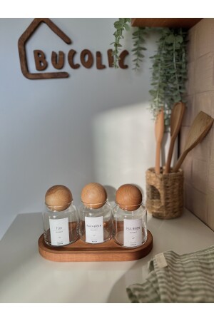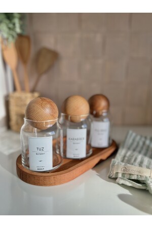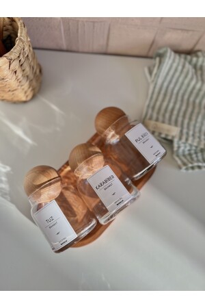 مكونات: 3 وعاء زجاجي مع غطاء كرات خشبية مع ملصقات، 1 مقعد خشبي كبير ملصقات المرسلة: الملح، الفلفل الأسود، ف