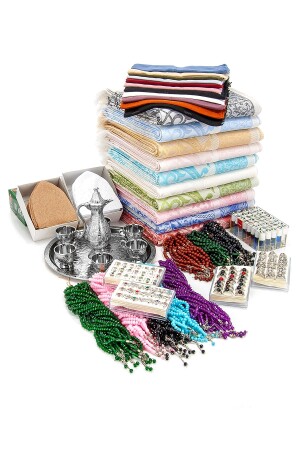 مجموعة هدايا الحج والعمرة من طراز MNZ-Samarkand - للـ 50 شخص محتويات المنتج: 50 طقم صلاة تافيتة ملونة، 50 قطعة