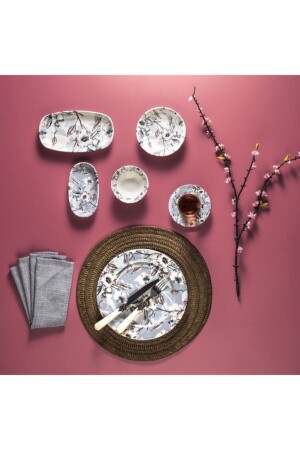 محتويات منتج MNZ: 6 أطباق 25 سم، 6 كوبات شاي، 6 أطباق شاي، 6 ملعقة شاي، 4 أكواب جام، 2 أطباق دائرية، 1 قار