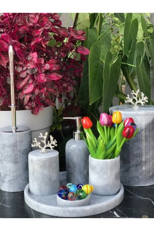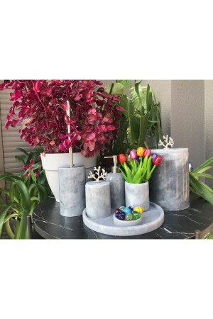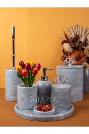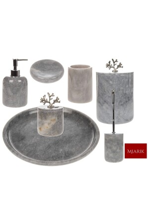 5 Parça Mermer Desen Mat Banyo Seti - Wc Fırçalık- Sıvı - Katı Sabunluk- Çöp Kovası- Diş Fırçalık