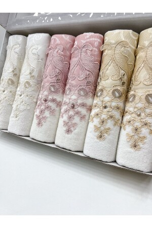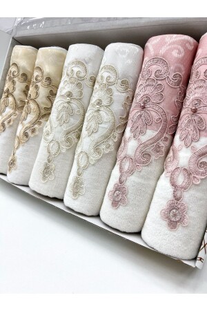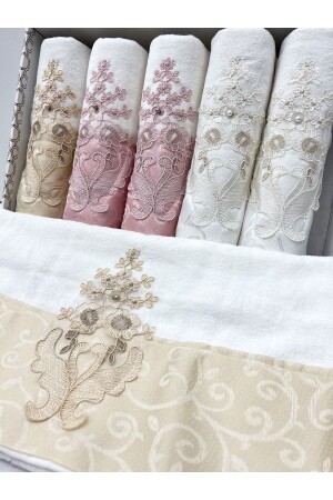 MNZ-AYHANHOME Laced Satin Embroidered Patterned Boxed Luxury Dowry Hand and Face Towel Set 50x90 6-Piece Hand and Face Towel Set نسيج