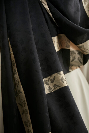 تمتلك سلسلة "MNZ-Our Gi Luxury Jacquard Shawl - 5" مظهرًا أنيقًا بنسيجها الحرير ، مع نمط جاكارد على القاعدة بأكم