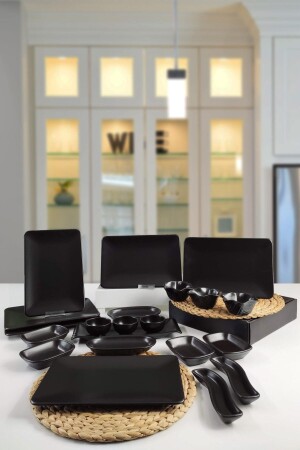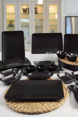 مجموعة الإفطار من قطعة MNZ-21 تضم 6 أطباق خدمة سوداء مات 31*21 سم مستطيل 4 أطباق قارب سوداء مات 13 سم مستطيل 3 أطباق