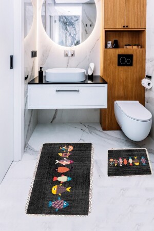 Lazer Kesim Peluş 2'li Oval Siyah Banyo Paspas Takımı