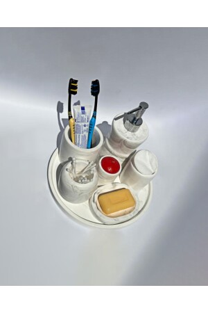 مجموعة من المنتجات المعدلة من الحمام. يحتوي المجموعة على: سلة 26 سم، وموزع صابون سائل، وموزع صابون صلب، ومحفظ فرشاة