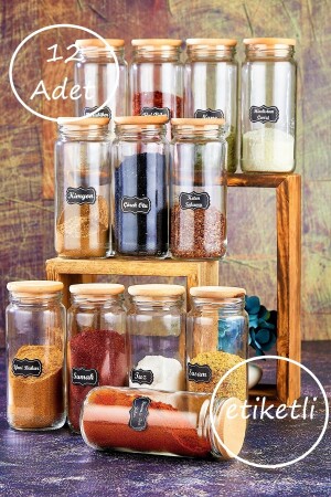 12'li Kapağı Kendinden Kaşıklı Ve Etiketli Baharatlık Seti 300 ml Gold Etiketli Cam Baharat Takımı