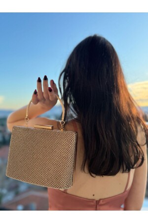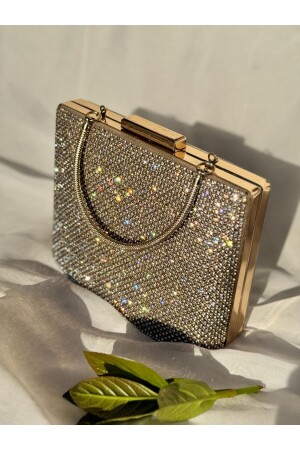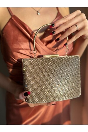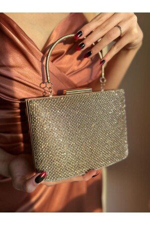 Simli Altın Renk Taşlı Işlemeli Kadın Abiye Portföy Clutch Çanta Indirimli