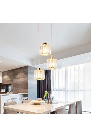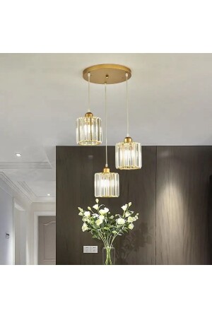 تعرض شركة MNZ-Ultra Home نموذج سيمورا الذهبية الملونة بـ Crystal Stone Metal Body Modern Aesthetic Ceiling Triple Pendant Chandelier ، وهو طريقة جديدة لإضاءة منز